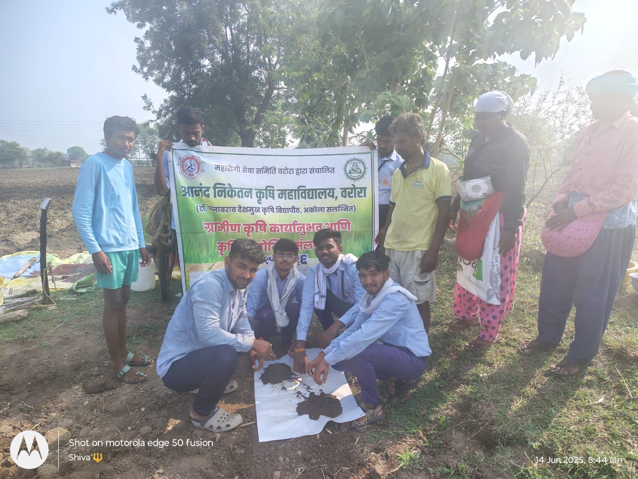 त्यामध्येच त्यांनी प्रात्यक्षिक ही करून दाखवले दरम्यान विद्यार्थ्यांनी शेतकऱ्यांच्या उपस्थितीमध्ये सतीशजी गायकवाड यांच्या शेतामध्ये जाऊन मातीचे नमुने गोळा केले व तपासणी करिता महाविद्यालयामध्ये पाठवले यामध्ये कृषी दूध राज दसोरा,गोपाळ मसलकर,अथर्व महल्ले,साहिल कंदुकवार,वैभव जनबंधू,शिवराज डुकरे,भूषण गानफाडे यांचा सहभाग असून मृदा विज्ञान आणि कृषी रसायनशास्त्र विभाग प्रमुख प्राचार्य डॉ .सुहासजी पोतदार सर व विषय विशेष तज्ञ सौ.पल्लवी उरकुडे मॅडम यांचे मोलाचे मार्गदर्शन लाभले.