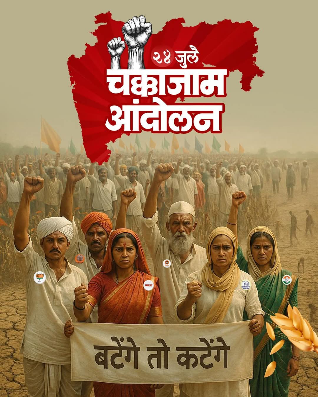 वरोरा(दि.23 जुलै) :- शेतकरी कर्जमाफी व दिव्यांग, शेतकरी,शेतमजूर, मच्छिमार, मेंढपाळ यांच्या इतर मागण्यासाठी संपूर्ण महाराष्ट्रात उद्या प्रहार जनशक्ती पक्षा कडून चक्काजाम आंदोलन उभारण्यात येणार असून चंद्रपूर नागपूर महामार्गावरील टेमुर्डा या ठिकाणी शेतकरी नेते किशोर डुकरे उपजिल्हा प्रमुख आशिष रणदिवे प्रहार विध्यार्थी संघटनेचे गणेश उराडे यांच्या नेतृत्त्वाखाली सकाळी ८ते १० वाजेपर्यंत चक्काजाम आंदोलन करण्यात येणार आहे.