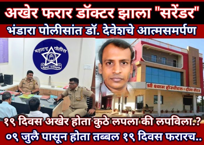 भंडारा (दि.29 जुलै) :- जिल्ह्यातील साकोली येथील गत १९ दिवसांपासून पोलिसांच्या हातावर तुरी देऊन फरार असलेला आरोपी डॉ. देवेश अग्रवाल याने अखेर आज २९ जुलैला भंडारा पोलिसासमोर शरणागती पत्करली. यातच साकोली पोलिसांनी त्याला स्थानिक न्यायालयात हजर केले असता पोलीस न्यायालयीन कोठडी मिळविण्यात यश प्राप्त झाले. आरोपी डॉ. देवेश अग्रवाल याला जामीन मिळावे याकरिता त्याच्या वकिलामार्फत जिल्हा न्यायालय, उच्च न्यायालय आणि सुप्रीम न्यायालय येथे याचिका दाखल करण्यात आली होती. परंतु तिन्ही ठिकाणी सदर याचिका फेटाळण्यात आली. त्यामुळे डॉ. देवेश अग्रवाल याच्यासमोर पर्याय नसल्यामुळे शेवटी शरणागतीला सामोरे जावे लागले.