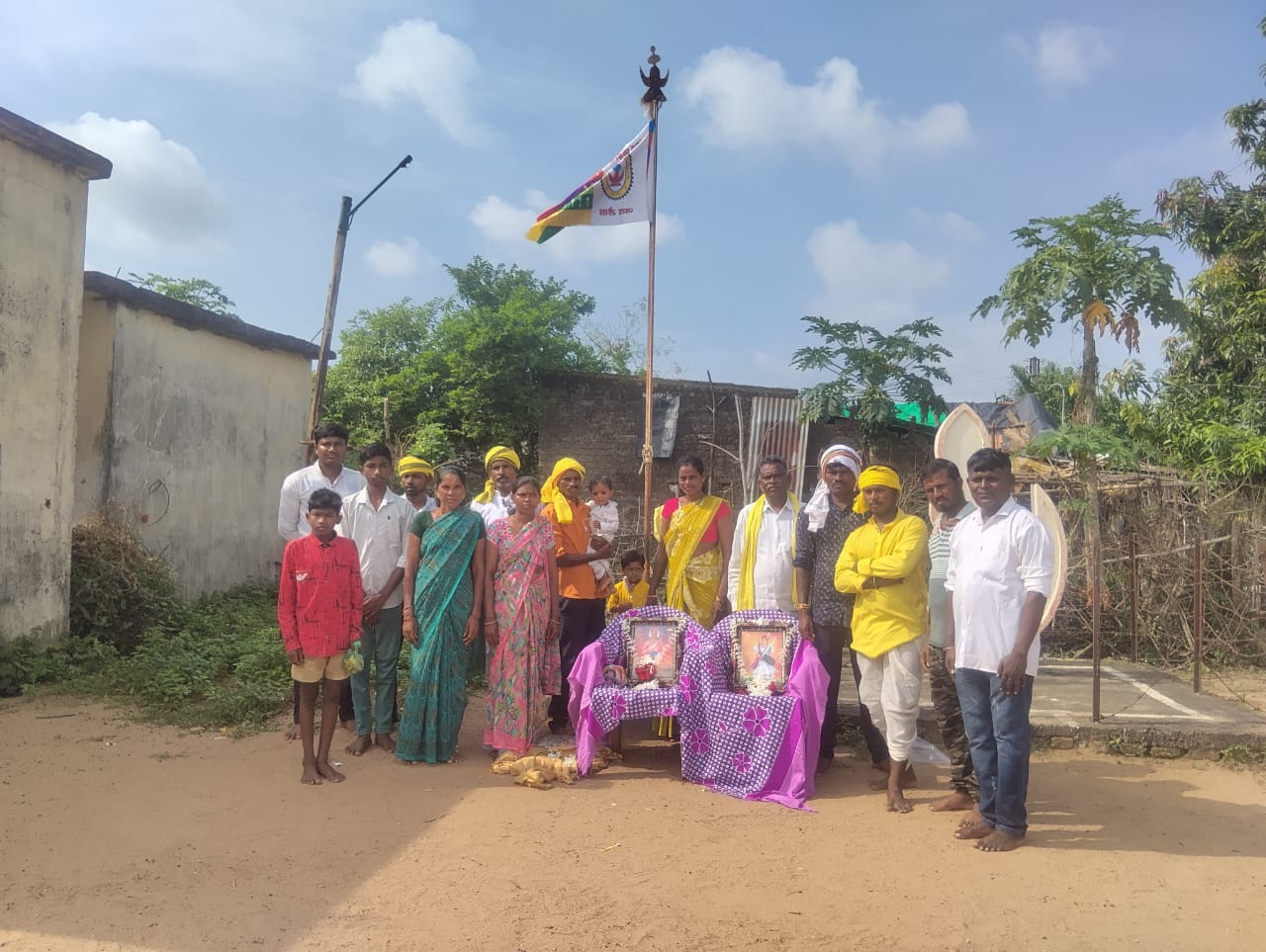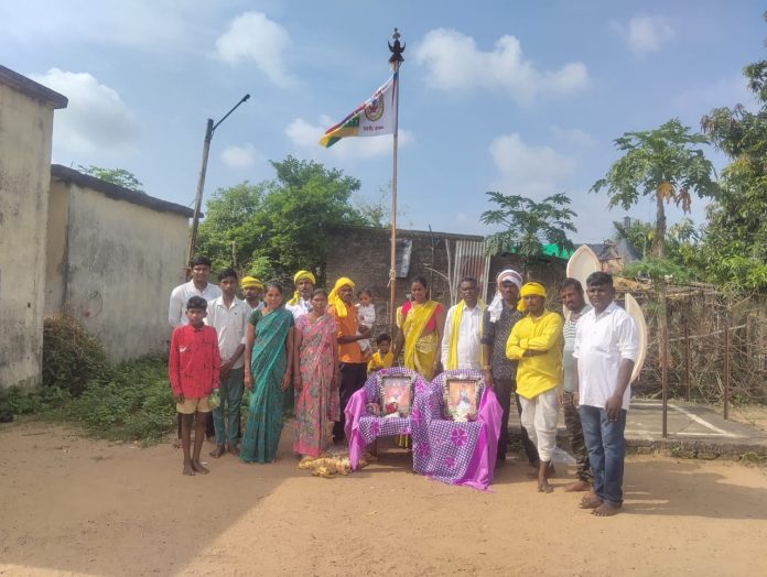 यावेळी राजा रावण मडावी, वीर बाबुराव शेडमाके यांच्या प्रतिमेचे हार अर्पण पूजन करून सप्तरंगी झेंडावंदन करण्यात आले.