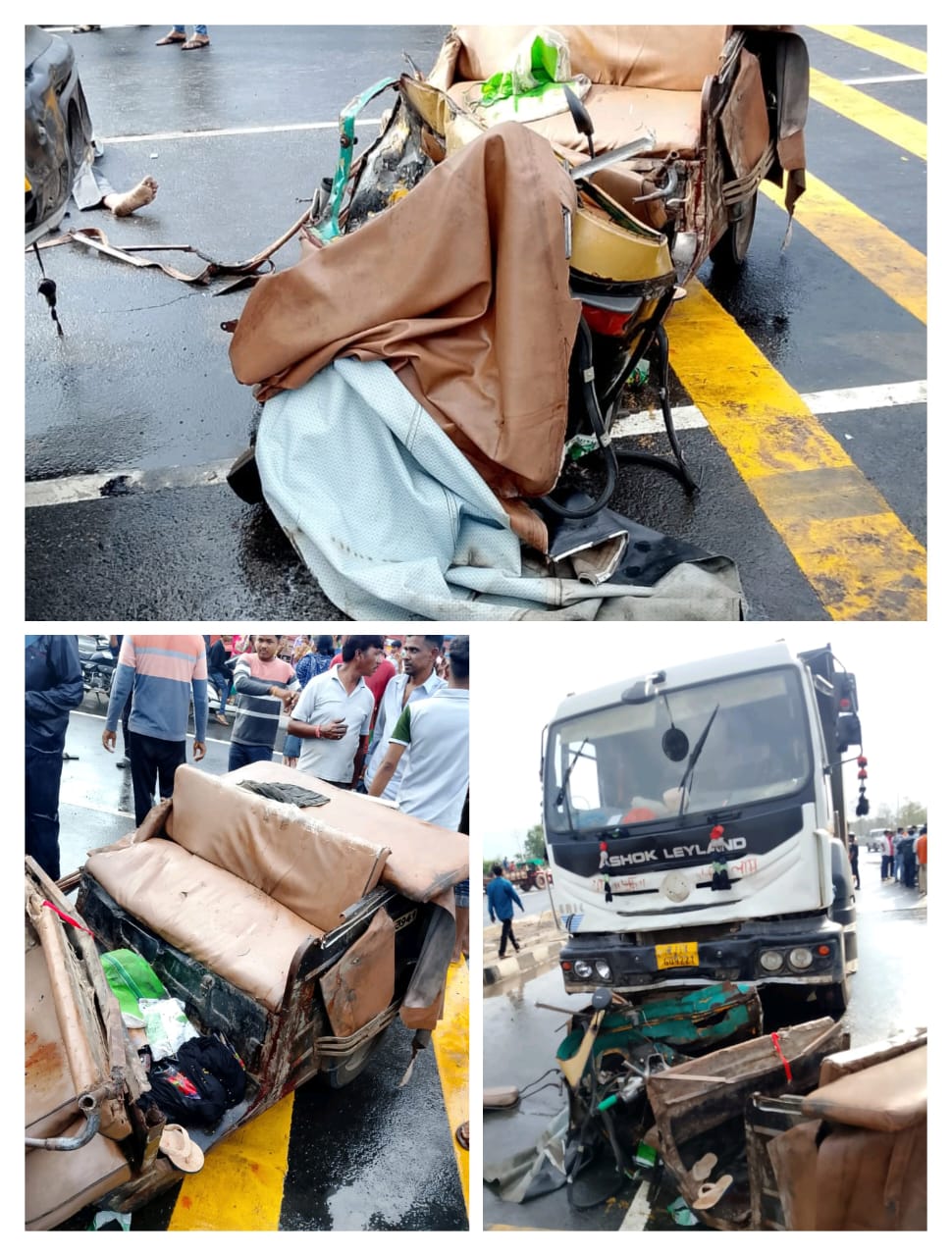 राजुरा येथुन पाचगाव कडे ॲटो चालक व सात प्रवाशी ॲटो ने जात होते. राजुरा शहरापासून दोन किलोमीटर अंतरावर महामार्गाचे काम सुरू आहे. आज एकाएकी येथे काम करण्यासाठी रस्ता वाहतुकीत बदल करण्यात आला. मात्र याविषयी कसलेही फलक लावले नव्हते. यामुळे ॲटो चालक संभ्रमात पडला आणि हायवे वर ॲटो घेतल्यानंतर हायवा ट्रक ने ॲटोला भिषण धडक दिली. ही टक्कर एवढी भिषण होती की संपुर्ण ॲटोचा चुराडा झाला. यावेळी तिन प्रवाशी जागीच ठार झाले. तर एक राजुरात व तिन जखमींना चंद्रपूर जिल्हा रूग्णालयात रेफर केल्यानंतर रस्त्यात दोघांचा मृत्यू झाला.