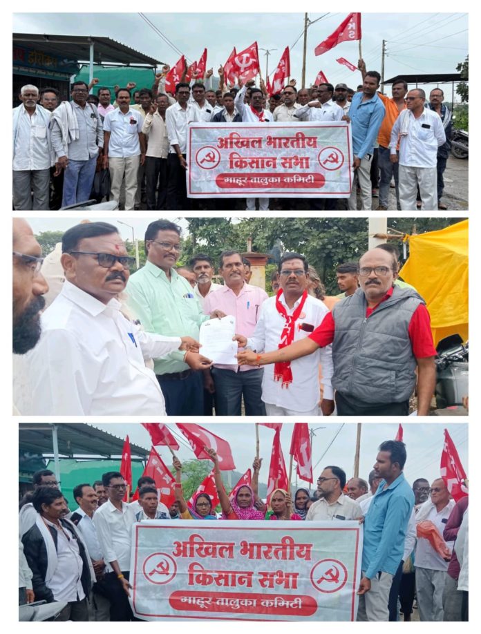 माहूर तालूक्यातील शेतकऱ्यांचा आतोनात नुकसान शेतीसह उभी पीके खरडून गेली आहे हाता तोंडाशी आलेला घास निसर्गणे हिराहुन घेतला आहे व तसेच प्रशासनाद्वरे लक्ष घालून तात्काळ पंचनामे करूण हेक्टरी पनास हजार रुपए नुकसान भरपाई ध्या व इतर मांगण्यासाठी किसान सभेचे आंदोलन होते त्यावेळी किसान सभेचे शंकर सिडाम (राज्य सहसचिव यांनी मोर्चेला संबोधित करतांना शेतकरी यांचा उत्पादन खर्च दररोज वाड़वला जात आसून मात्र शेती मालाचे भाव सातत्य्याने पड़ले जात आहे शेती मालावरील आयात रद केला आहे त्यामुळे मोठया प्रमाणात कापूस सोयाबीन आयात करून सुदधा देशी शेतकर्योंचे शेती मालाचे भाव पडल्याने शेतकऱ्यांचे हाल होत आहेत आसे प्रतिपादन कॉ. शंकर सिड़ाम यांनी केले