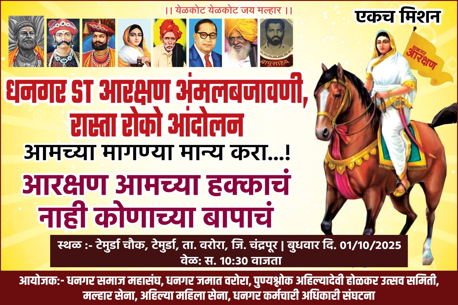 वरोरा तालुक्यातील टेमुर्डा येथे धनगर आरक्षण अंबलबजावणी संदर्भात उद्या दिनांक 1ऑक्टोबर 2025 रोज बुधवार ला सकाळी 10.30 वाजता रास्ता रोको आंदोलन आहे . धनगर समाजाची आरक्षण ची अंबलं बजावणी करून धनगर समाजाला एसटी प्रवर्गा मध्ये समाविष्ट करणे, शेळ्या मेंढयाना चराईसाठी वनविभाग आरक्षित जागा देणे, अहिल्यादेवी होळकर महामेष योजना चालु करणे, यशवंतराव घरकुल योजनेचा लाभ मिळावा, अश्या विविध मागण्यासाठी रास्ता रोको आंदोलन आहे.