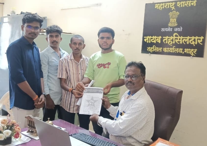 ह्या वेळी एस एफ आय माहूर तालुका निमंत्रक श्रेजल देवपूलवार, गोपाल पवार,अजिंक्य पोटगंटवार,आनंद केंद्रे उपस्तित होते. यावेळी तहसीलदार अभिजीत जगताप यांच्या वतीने नायब तहसीलदार कैलास जेठे यांनी निवेदन स्वीकारले.