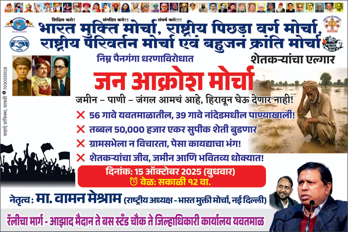आझाद मैदान, बस स्टँड चौक, यवतमाळ येथून जिल्हाधिकारी कार्यालयापर्यंत “जन आक्रोश मोर्चा” काढण्यात येणार आहे.