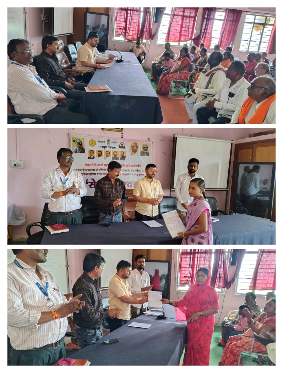 छत्रपती शिवाजी महाराज महाराजस्व अभियाना अंतर्गत राष्ट्रनेता पंतप्रधान नरेंद्रजी मोदी यांचा जन्मदिवस तसेच राष्ट्रपिता महात्मा गांधी यांच्या जयंती निमित्त 17 सप्टेंबर ते 2 ऑक्टोंबर पर्यंत शासनाकडून सेवा पंधरवाडा साजरा केला जात असल्याने या सेवा पंधरवाड्या अंतर्गत नागरिकांना शासनाच्या सर्व योजनांचे लाभ मिळवून देण्याच्या निमित्ताने तहसीलदार अभिजीत जगताप यांच्या प्रमुख उपस्थितीत नागरिकांना लाभार्थ्यांना अन्नसुरक्षा योजनेचा लाभ दि 15 रोजी कार्यक्रम घेऊन देण्यात आला.