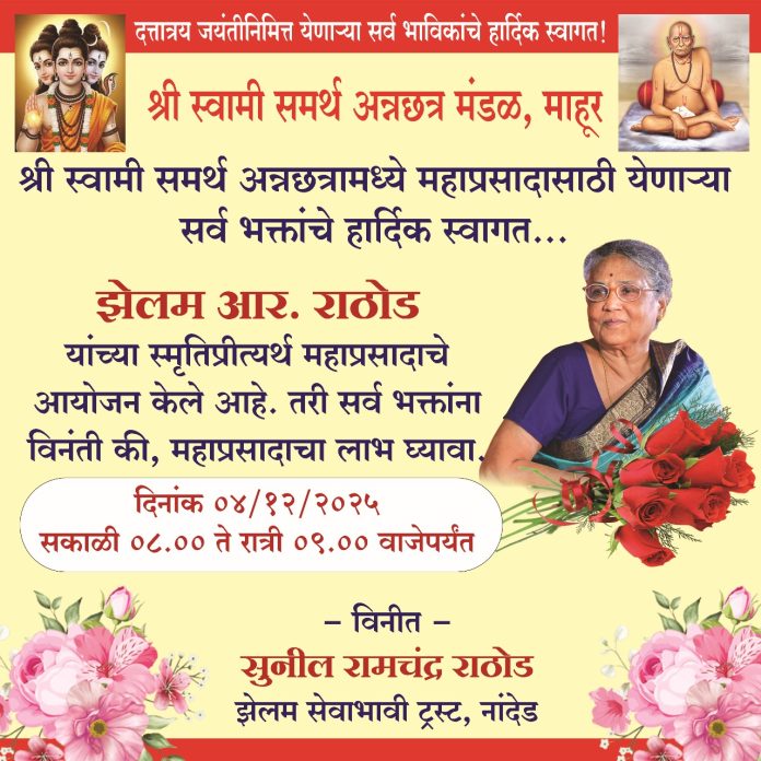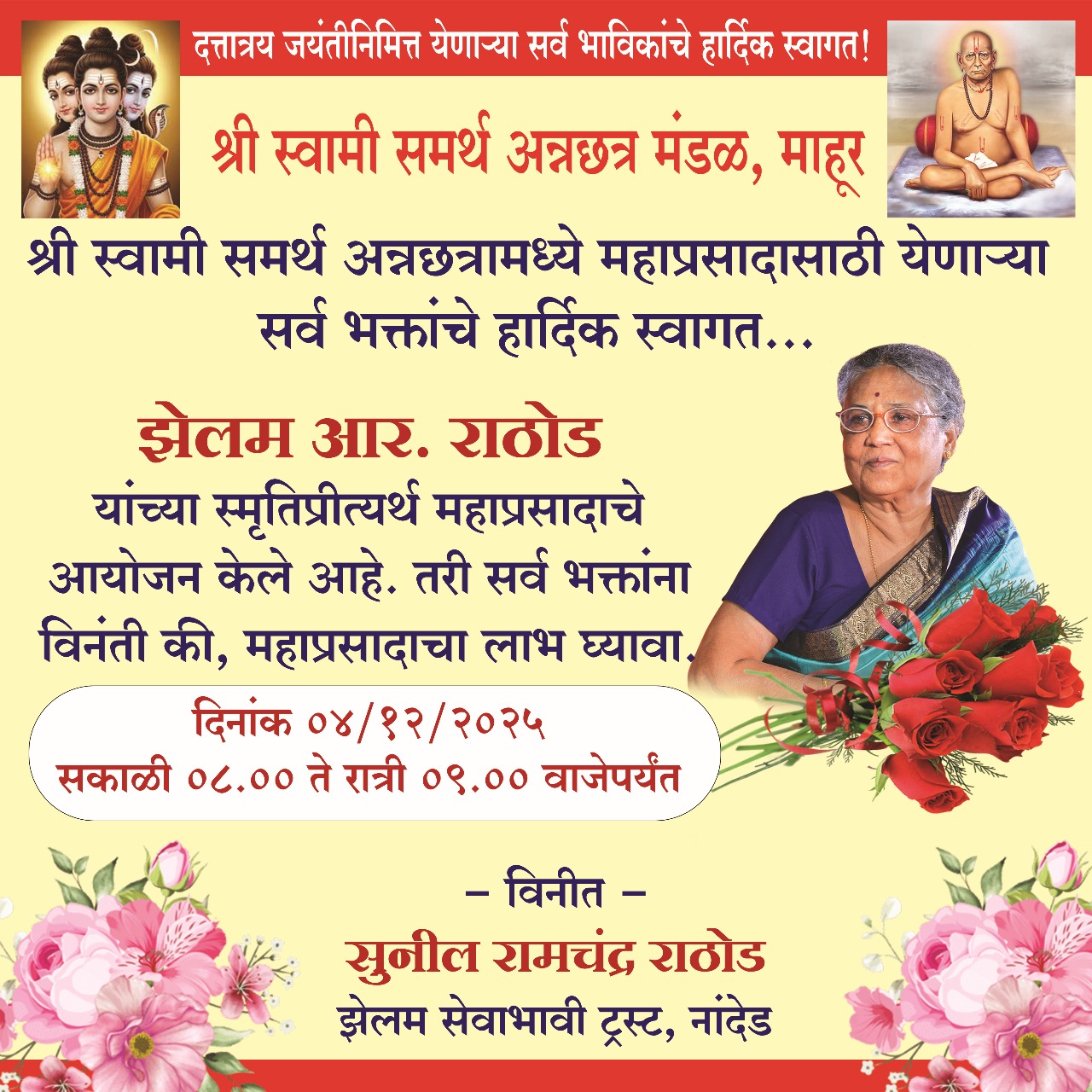 प्रतिवर्षीप्रमाणे याही वर्षी दत्त पौर्णिमा निमित्त नांदेड येथील संधीपणी पब्लिक स्कूल चे संचालक श्री सुनील भाऊ राठोड यांच्यातर्फे प्रसादाचे आयोजन सकाळी आठ ते रात्री दहा वाजेपर्यंत चालू राहणार आहे तरी दर्शनाला आलेल्या सर्व भाविक भक्तांनी प्रसादाचा लाभ घ्यावा ही श्री स्वामी समर्थ अन्नछत्र मंडळ विश्वस्त तसेच सेवेकरी यांच्यातर्फे नम्र विनंती
