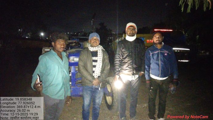 तालुक्यात अनेक ठिकाणी पैनगंगा नदी पात्रावर बैठ्या पथकांची नेमणूक झाल्याने अनेक वाळू तस्कर नाल्यावरून वाळू चोरी करण्याचा प्रयत्न करत असल्याची माहिती मिळत असल्याने याआधी अनेक ठिकाणी ट्रॅक्टर पकडून तहसील कार्यालयात जमा करण्यात आले आहेत तर दि 15 रोजी रात्री तहसीलदार अभिजीत जगताप नायब तहसीलदार कैलास जेठे यांच्या मार्गदर्शनाखाली फिरत्या पथकात गस्तीवर असलेले ग्राम महसूल अधिकारी पवन यादव मनोहर चेके सुनील वनवे ओमप्रकाश तवर कोतवाल बंडू चिरंगे विलास शेळके संदीप रणमले हे कुपटी ते साकुर रस्त्यावर गस्त घालत असताना नाल्यातून वाळू भरून बाहेर आलेला विना नंबरचा फार्मट्रेक कंपनीचा ट्रॅक्टर दिसल्याने त्यास अडवून पाहणी केली असता त्यामध्ये विनापरवानगी वाळू भरून वाहतूक करत असलेला आढळून आल्याने त्यास तत्काळ पकडून माहूरच्या तहसील कार्यालयात आणून पाच लाखाचा मुद्देमाल जप्त करण्यात येऊन त्यावर महसूल सहाय्यक वैभव घोडे यांनी तहसीलदार अभिजीत जगताप यांच्या मार्गदर्शनाखाली कायदेशीर कारवाईसाठी प्रस्ताव पाठविला आहे.