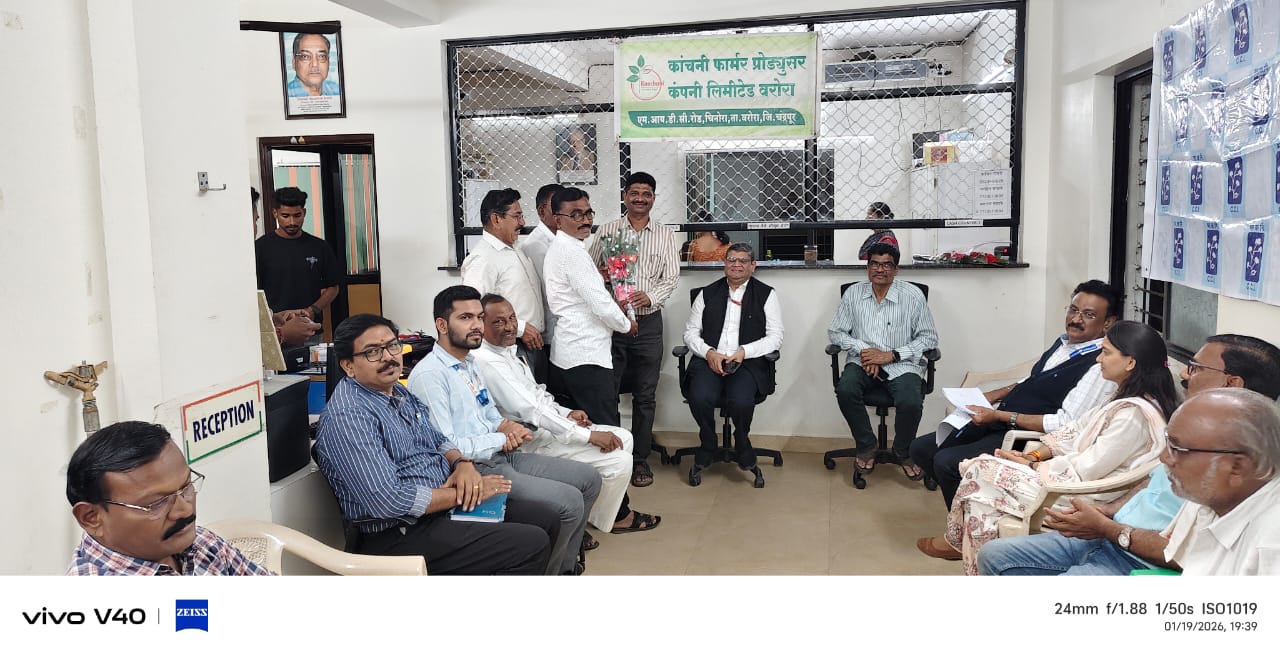 प्रधानमंत्री धन धान्य कृषी योजने अंतर्गत कांचनी फार्मर प्रोड्युसर कंपनी लिमिटेड, चिनोरा येथे संचालक व शेतकऱ्यांसोबत चर्चा करण्यासाठी केंद्रीय सहसचिव वित्त विभाग भारत सरकार तथा धन धान्य कृषी योजनेचे नोडल अधिकारी आशिष मोरे (IAS) यांनी कांचनी शेतकरी कंपनीस भेट दिली. त्यावेळी कांचनीचे वतीने पुष्पगुच्छ व संविधान ग्रंथ देऊन त्यांचे स्वागत करण्यात आले. तसेच चंद्रपूर जिल्हा अधीक्षक कृषी अधिकारी शंकर तोटावार व आत्मा प्रकल्प अधिकारी कुसळकर यांचे स्वागत कंपनीचे संचालक बळीरामजी डोंगरकर व हिरालाल बघेले यांनी केले. केंद्र सरकारने जुलै 2025 मध्ये प्रधानमंत्री धन धान्य कृषी योजना (PMDDKY) सुरू केली आहे. ही योजना विशेषता देशातील 100 आकांक्षित जिल्ह्याच्या विकासासाठी आखण्यात आलेली आहे. यामध्ये महाराष्ट्रातील नऊ जिल्ह्यांचा समाविष्ट करण्यात आलेला आहे. यात प्रामुख्याने चंद्रपूर जिल्ह्याचा समावेश आहे.