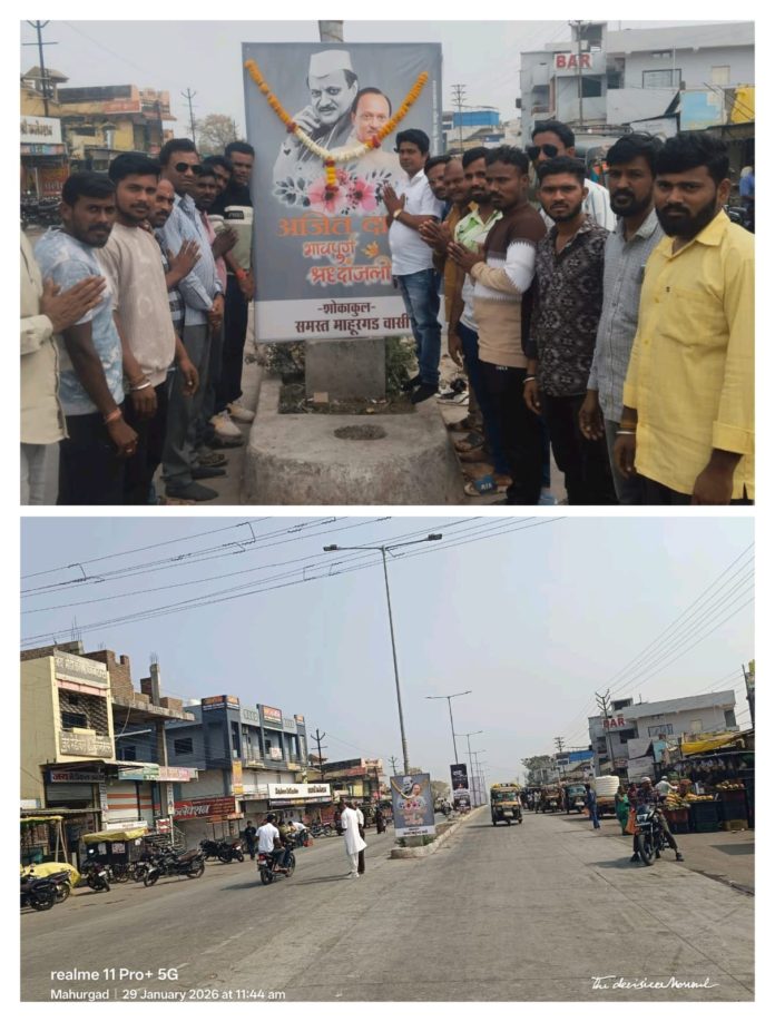 बुधवारी सकाळी उपमुख्यमंत्री अजितदादा यांच्या विमानाला अपघात झाला, त्यात त्यांचा मृत्यू झाल्याची बातमी वाऱ्यासारखी माहूर तालुक्यात पसरली, प्रत्येक व्यक्ती सन्न झाला.सायं.डॉ. बाबासाहेब आंबेडकर चौकात त्यांच्या प्रतिमेला पुष्पमाला अर्पण करून त्यांना श्रद्धांजली वाहण्यात आली. यावेळी भाजपानेते डॉ.निरंजन केशवे,विजय आमले,ज्येष्ठ पत्रकार नंदू संतान,वसंत कपाटे,रा.काँ. (शरद पवार )चे तालुकाध्यक्ष मेघराज जाधव, रा. काँ.चे शहराध्यक्ष सईद अली आदींनी आपल्या भावना व्यक्त केल्या.यावेळी नंदकुमार जोशी,अविनाश टनमने पत्रकार शंकर भालेराव अंबादास मुकटे शेख रफिक ईलास बावाणी,राजू दराडे. संतोष रेकूलवार,डी. के.जोशी,राज ठाकूर,सुरेश गिऱ्हे, सचिन जासूद, संजय घोगरे, अशोक उप्पलवाड आदींची उपस्थिती होती.