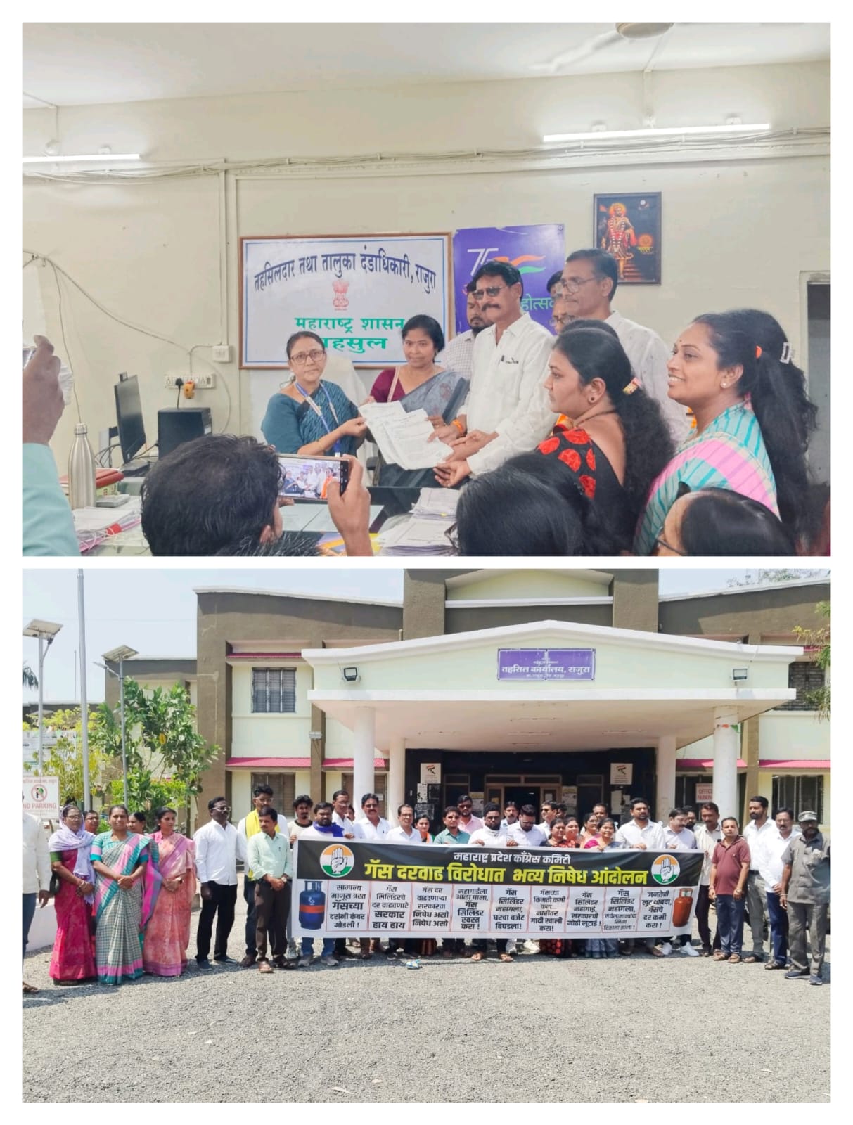 राजुरा (दि.12 मार्च) :– केंद्र व राज्य शासनाच्या इंधन दरवाढीच्या धोरणाविरोधात तसेच घरगुती गॅस सिलेंडरच्या वाढलेल्या किमती आणि कृत्रिम तुटवड्याच्या निषेधार्थ आज राजुरा येथे तीव्र धरणे आंदोलन करण्यात आले. महाराष्ट्र प्रदेश काँग्रेसचे प्रदेशाध्यक्ष मा. हर्षवर्धनजी सपकाळ व चंद्रपूर जिल्हा काँग्रेस कमिटीचे जिल्हाध्यक्ष माजी आमदार सुभाषभाऊ धोटे यांच्या सूचनेनुसार राजुरा नगरपरिषदेचे नगराध्यक्ष अरुणभाऊ धोटे आणि तालुका काँग्रेस कमिटीचे अध्यक्ष रंजन लांडे यांच्या नेतृत्वाखाली संविधान चौक येथे हे आंदोलन पार पडले. यानंतर संविधान चौक ते तहसील कार्यालय पर्यंत रॅली काढण्यात आली. यावेळी जोरदार नारेबाजी करीत शासनाचा निषेध करण्यात आला. आंदोलनाच्या शेवटी यासंदर्भातील विविध मागण्यांचे निवेदन तहसीलदार राजुरा यांच्या मार्फत महामहिम राष्ट्रपती द्रौपदी मुर्मु यांना पाठविण्यात आले व समस्या सोडवण्याची विनंती करण्यात आली. गॅस दरवाढ व वाढत्या महागाईविरोधात तीव्र निषेध नोंदविण्यात आला.